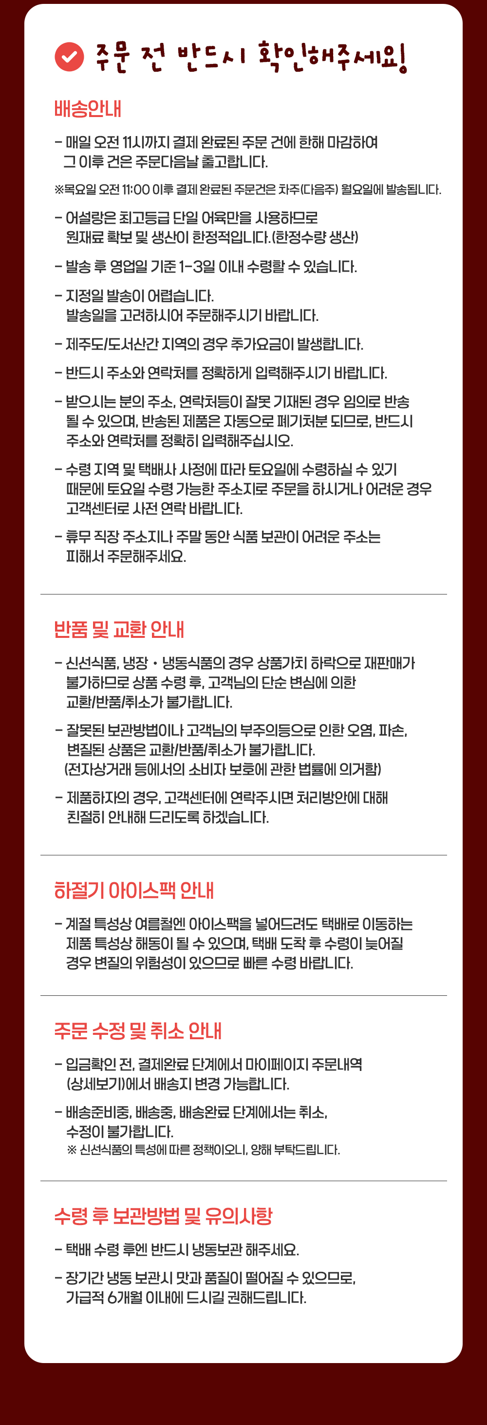 - 계절 특성상 여름철엔 아이스팩을 넣어드려도 택배로 이동하는 제품 특성상 해동이 될 수 있으며, 택배 도착 후 수령이 늦어질 경우 변질의 위험성이 있으므로 빠른 수령 바랍니다