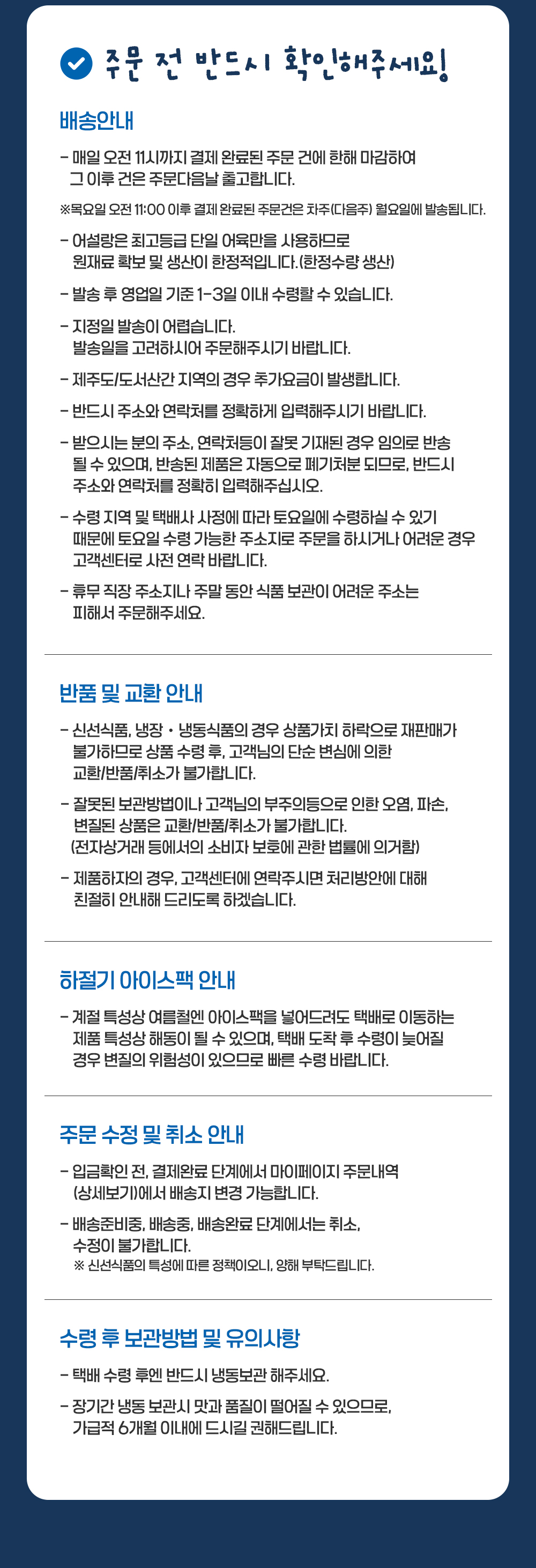 - 계절 특성상 여름철엔 아이스팩을 넣어드려도 택배로 이동하는 제품 특성상 해동이 될 수 있으며, 택배 도착 후 수령이 늦어질 경우 변질의 위험성이 있으므로 빠른 수령 바랍니다