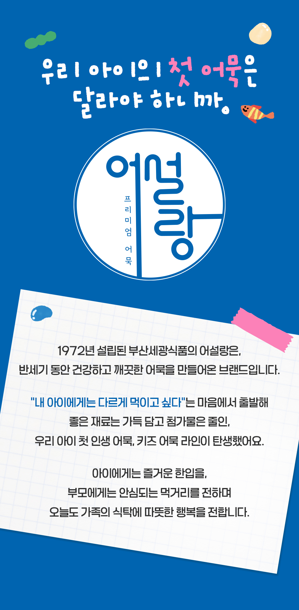 - 어설랑은 최고등급 단일 어육만을 사용하므로 원재료 확보 및 생산이 한정적입니다. (한정수량 생산)